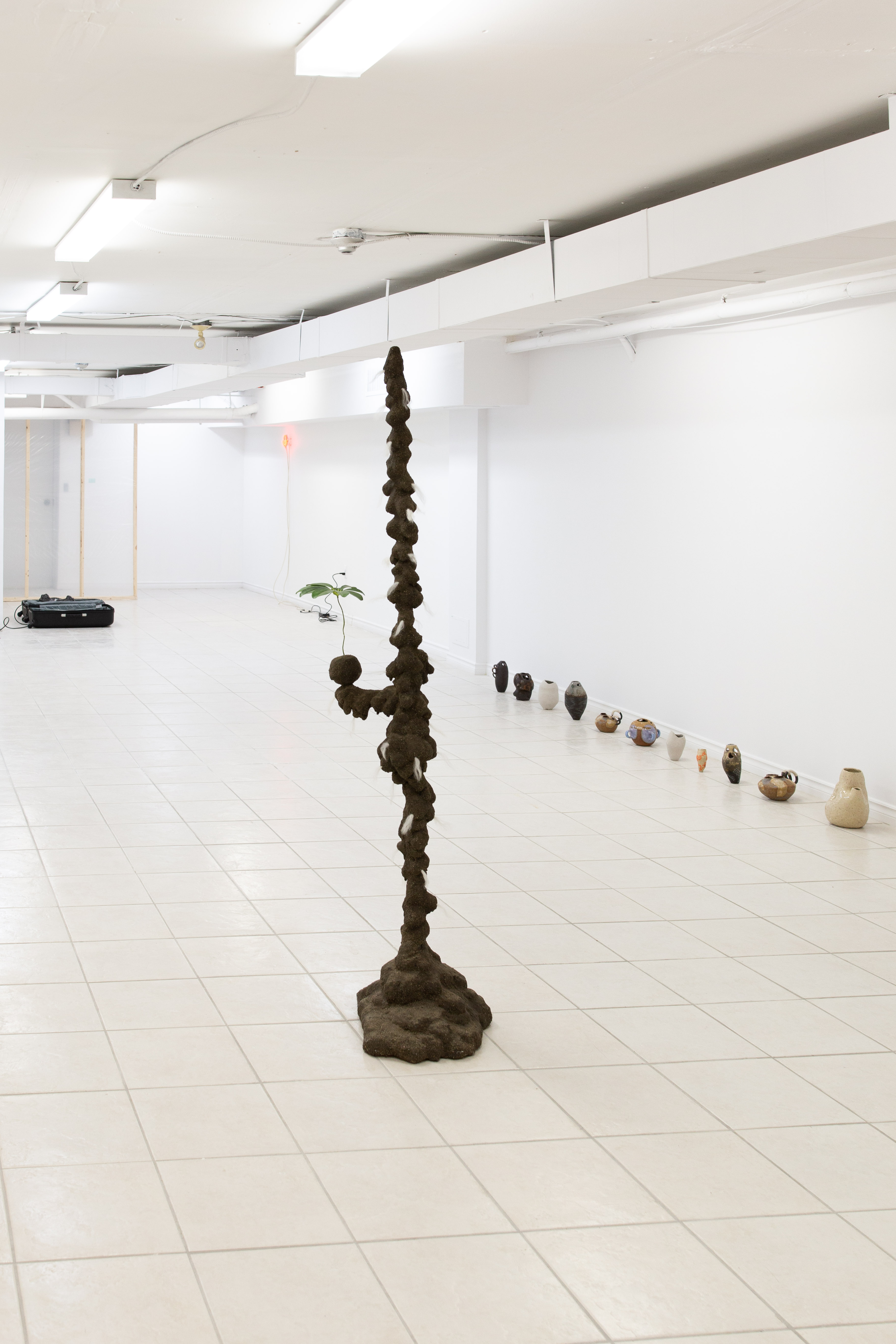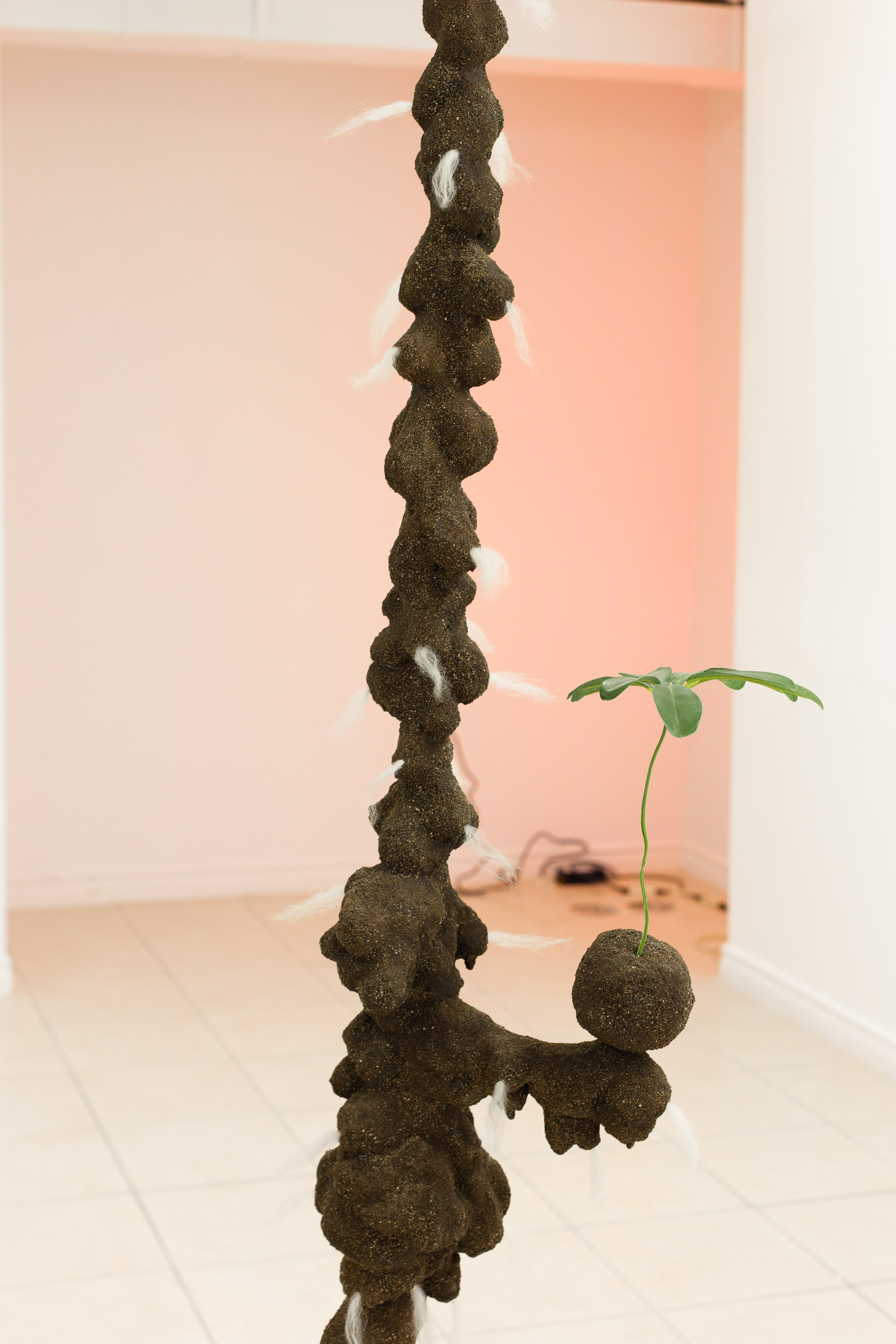 Alex Tedlie-Stursberg, Woolly Marker, 2018, Fibreglass, Epoxy Resin, Sand, Wood, Found Fur, Fake Plant, 6’ x 1’ x 2’
