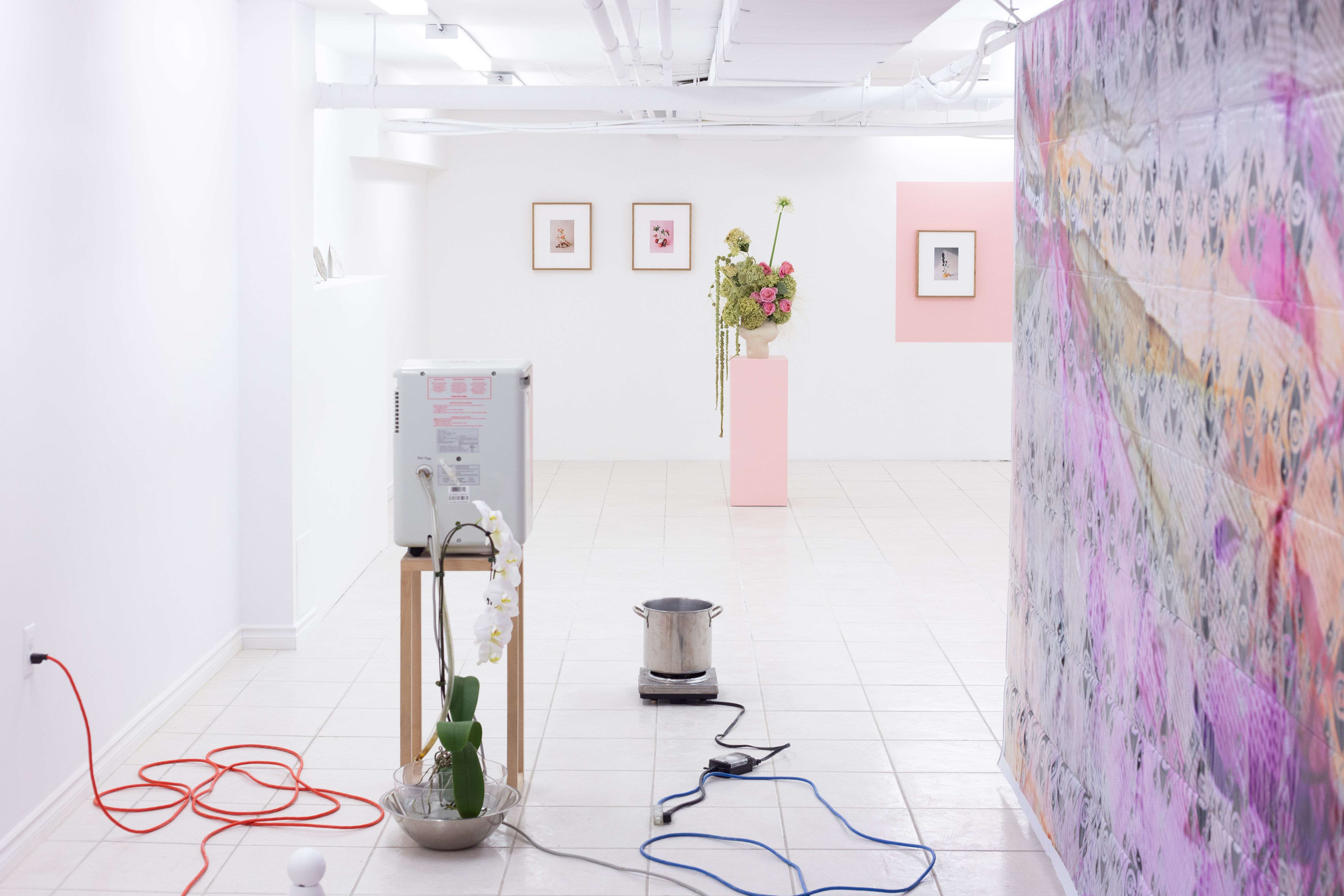 Ryan Grover, still nothing yet, 2020 (ongoing), Phalaenopsis Orchid, steel bowl, salad spinner, dehumidifier, wooden stand, humidifier, cardboard box, space heater, wire rack, hot plate, pot, thermostat, rock, outlet timers, extension cables, dimensions variable