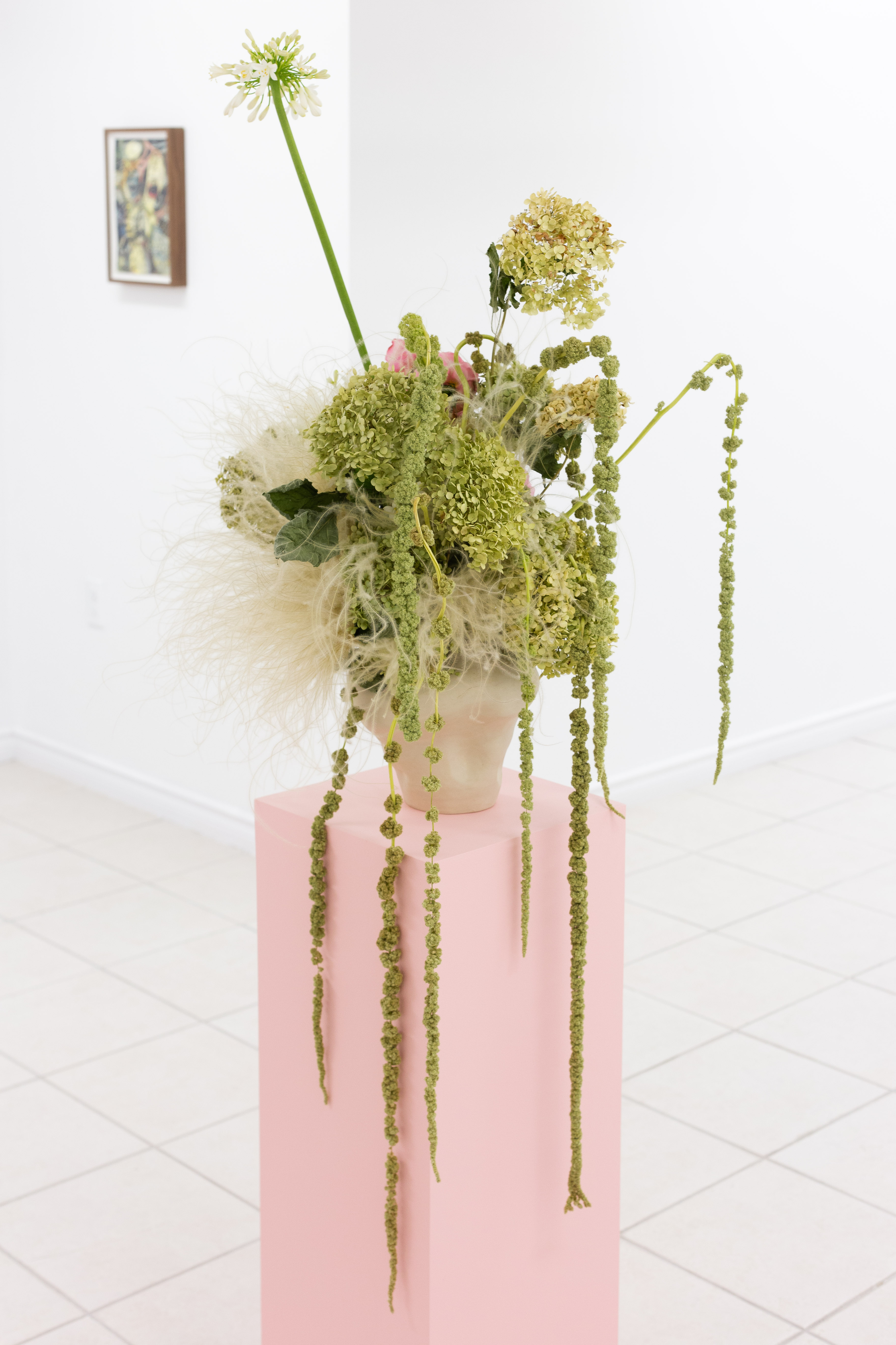 Susannah van der Zaag, Untitled arrangement, 2021, stoneware, hydrangea, amaranthus, anthurium, pedestal, dimensions variable