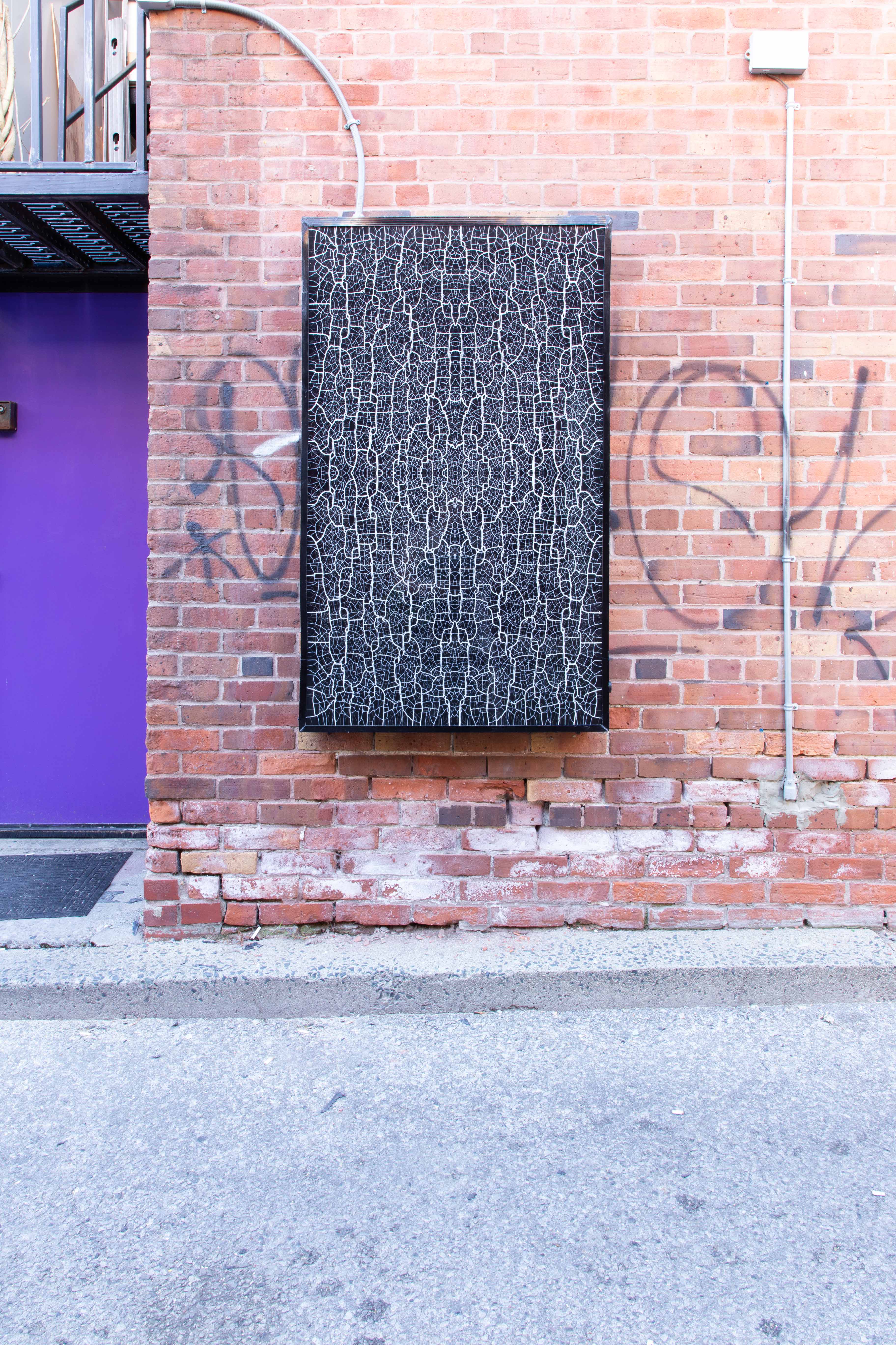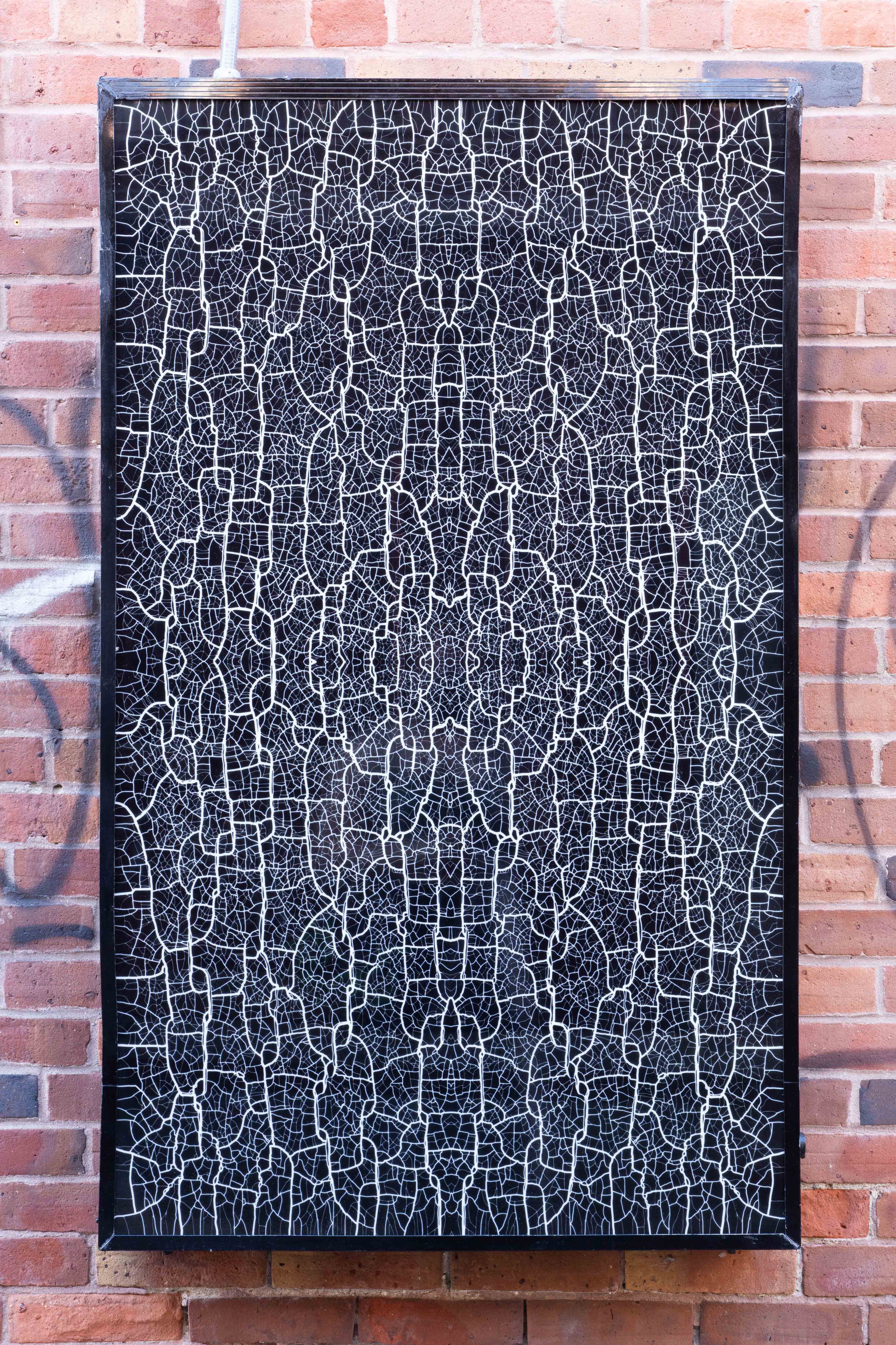 Mirrored cracks was created by reproducing the cracks found on a local vinyl sign and mirroring this network of cracks on both the Y and X axis to create a pattern that extends to the boundaries of the light box print. The process to describe the cracking phenomenon of matter, which occurs in small and big stuff is called fracture mechanics sometimes referred to as the physics of failure. Every network of cracks begins with a single crack on a seemingly homogeneous surface. This initial crack advances until it collides with an irregularity in the material. A second crack then forms that advances to or emerges from the first crack because of the release of energy created by the first crack. If the second crack advances toward the first crack it will connect with the first crack at 90 degrees. A historical record of this relationship is its shape. Then, a third crack forms and a fourth, fifth, sixth and so on and so forth until a type of equilibrium is found. The path for each of these cracks is determined by inconsistencies in the material and by the presence of other cracks. A crack advances through a release of energy from stress that has accumulated at its tip. Cracking is irreversible. Cracks cannot close or reverse course. A network of cracks, like in mirrored cracks, provides a history and picture of its growth. A mirror, however, folds that growth back onto itself.