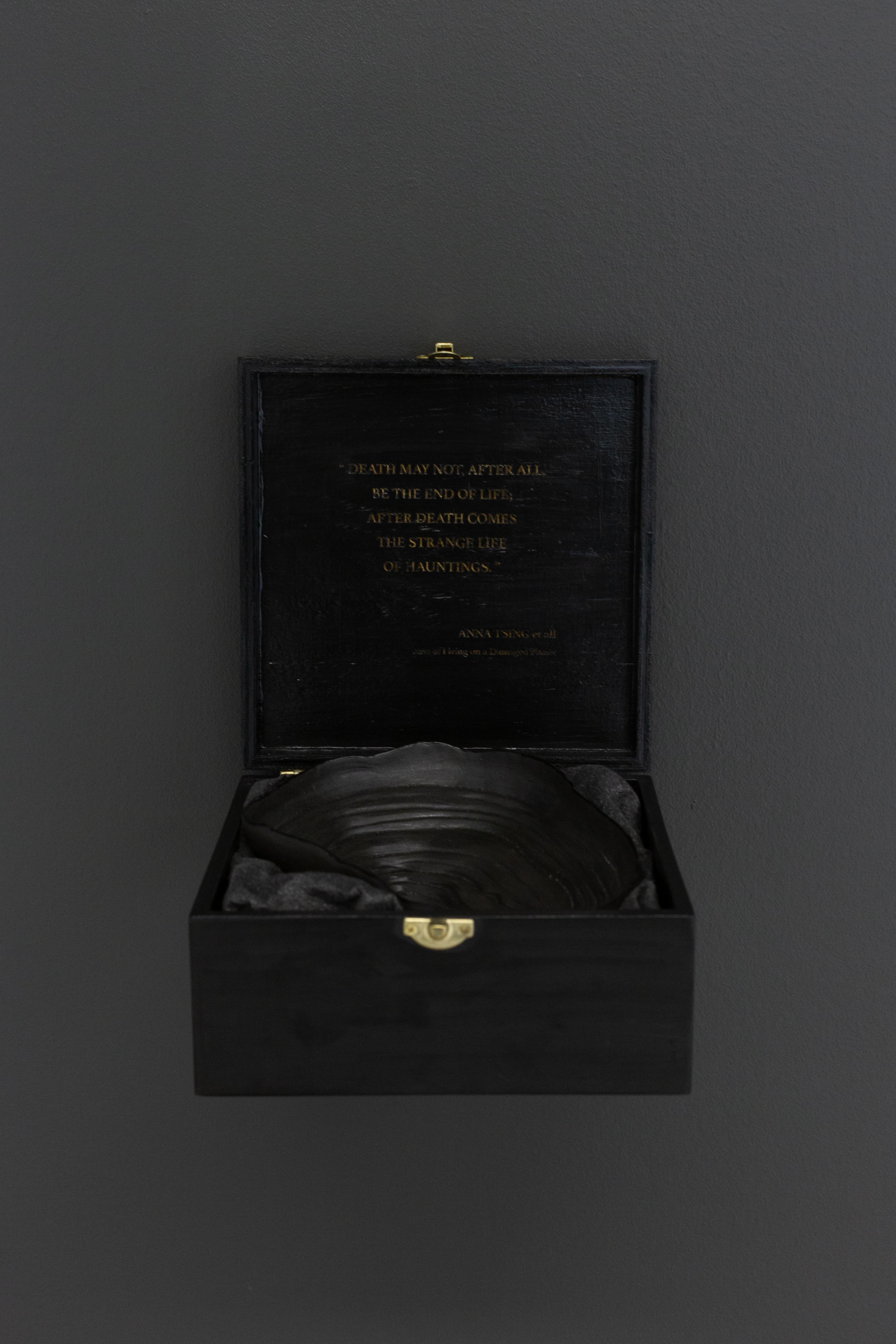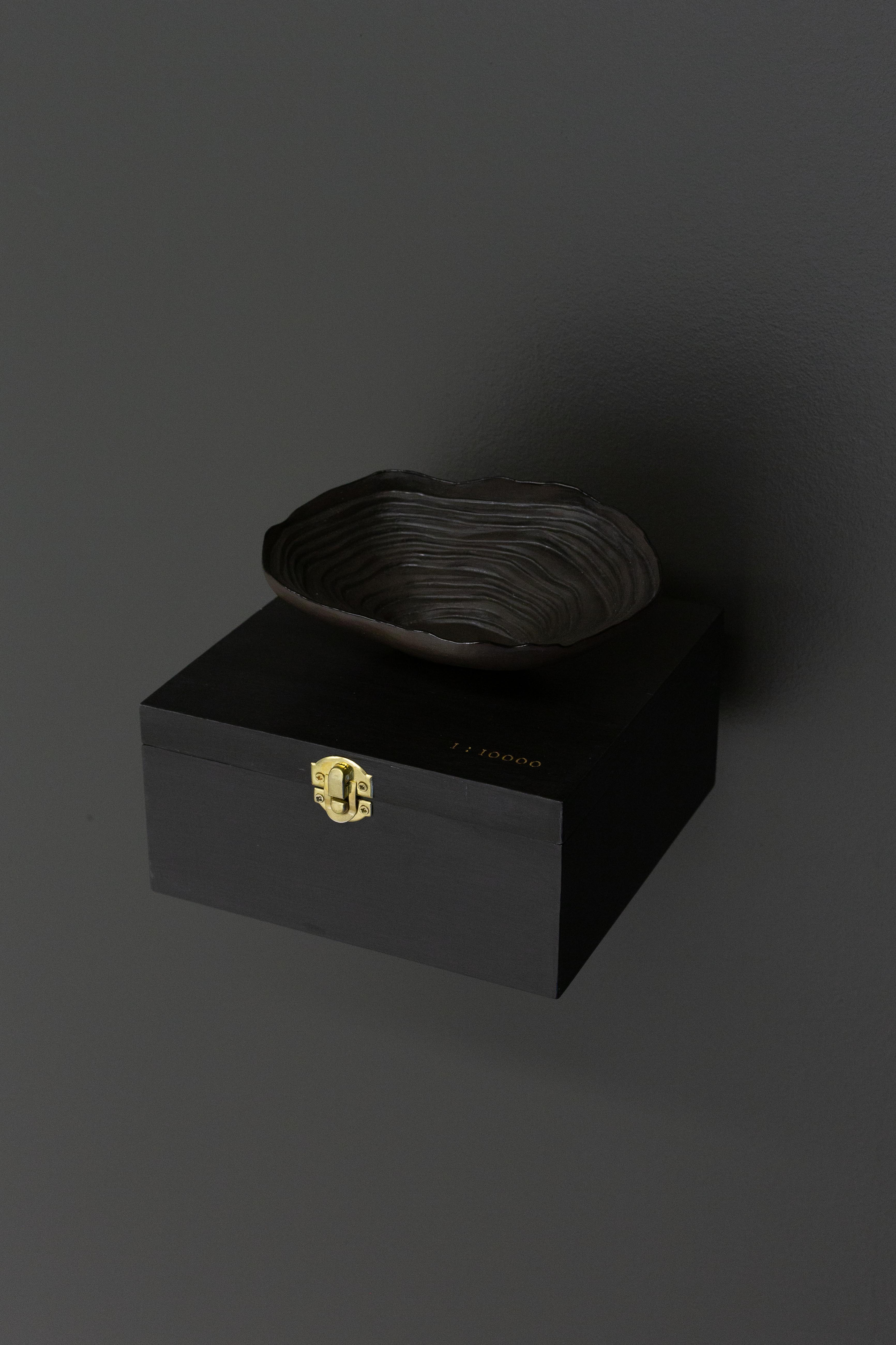 Dana Prieto, 1:10,000, 2018, Glazed black stoneware, hand made with clay from territories surrounding Bajo de la Alumbrera mine, Catamarca, Argentina. Wooden box, gold leaf engraving