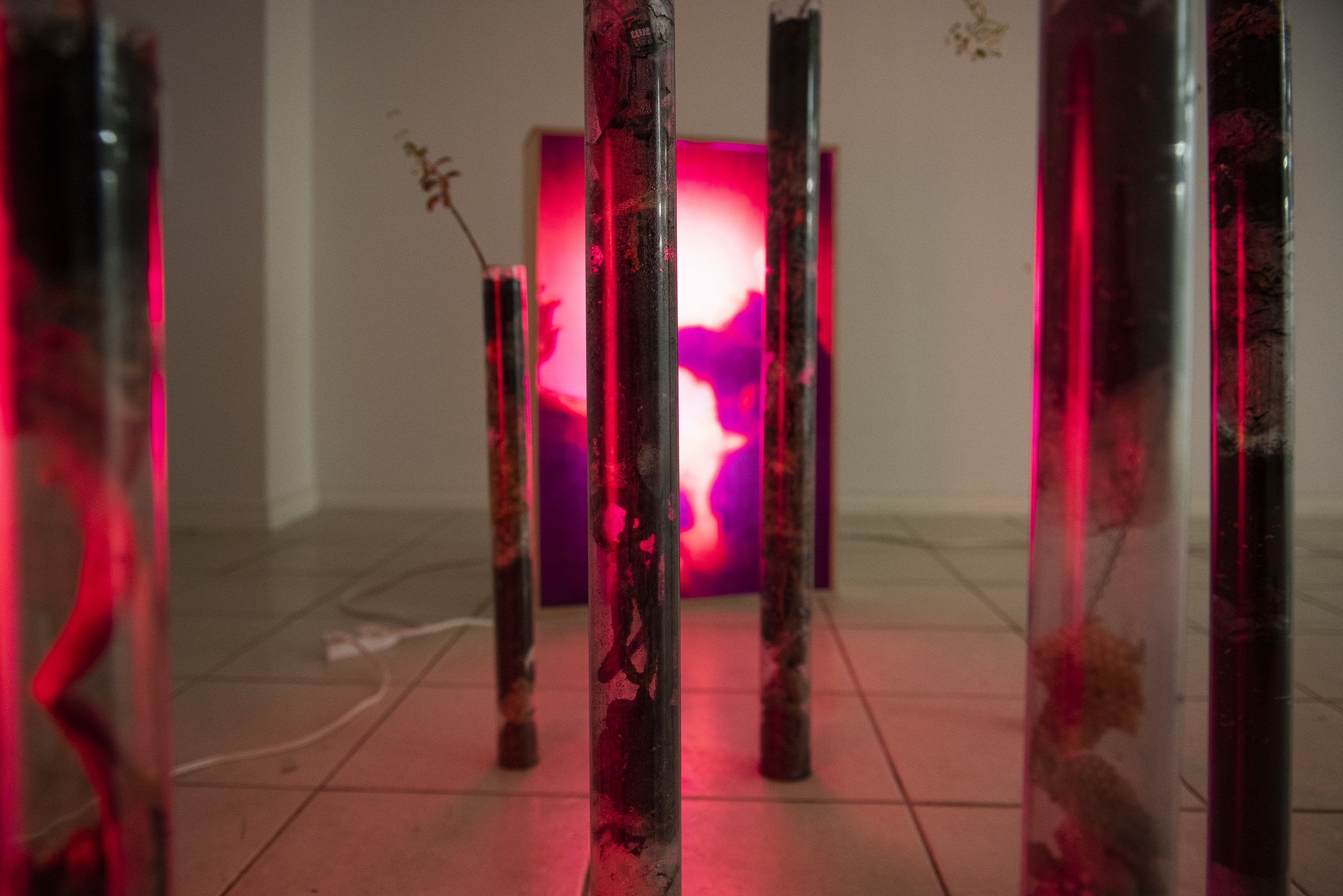 Maria Simmons, Wavelength of a Spore/Attachment, 2020, Polypropeline prints, grow lights, birch plywood, Mother of Thousands, silicone, plastic bags, grogged clay, potting soil, dirt, microbial culture, brick, latex gloves, cement, golf ball, hardened plastic tubing, plumbob, 5 euro note, pheasant feathers, photographic slides, moss, usnea lichen, ear plugs, shrink wrap, nylon rope, steel wool, honeycomb, beaver wood shavings, fermented garbage* (velvet ribbon, iPhone charger, Skittles®, fidget spinner, newspaper bag, succulent leaves, apple juice, wristband), Heinz® ketchup packets, Encapso™ k, GooGone®, Maynard’s Sour Patch Kids™ mango wrapper, Trident gum insert, Reese’s Pieces®, Energizer Max® box, sticky note with “oyster” written on it, salt, water *Fermented 3 years, dimensions variable