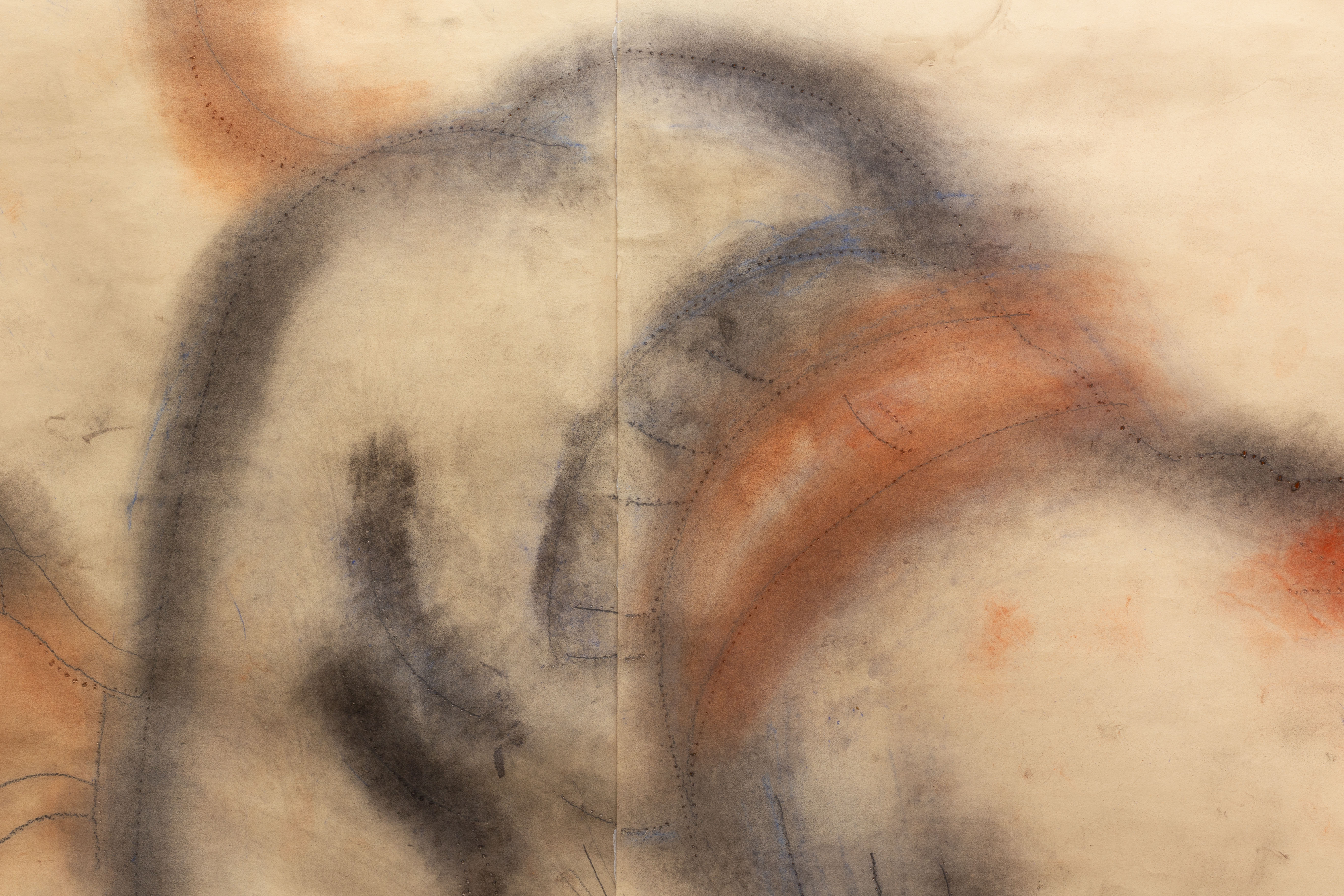 Kim rends, scribes, marks, scores his images, blackens and illuminates, exposes the bones, skeletons, muscles, and sinews of painting to the brain. Kim is the scientist of painters’ images, expanding them in ways that feel molecular—slicing strands of pigment to add, remove, or alter their genes. The images land on a flat surface with four corners, but their impact contaminates your insides.