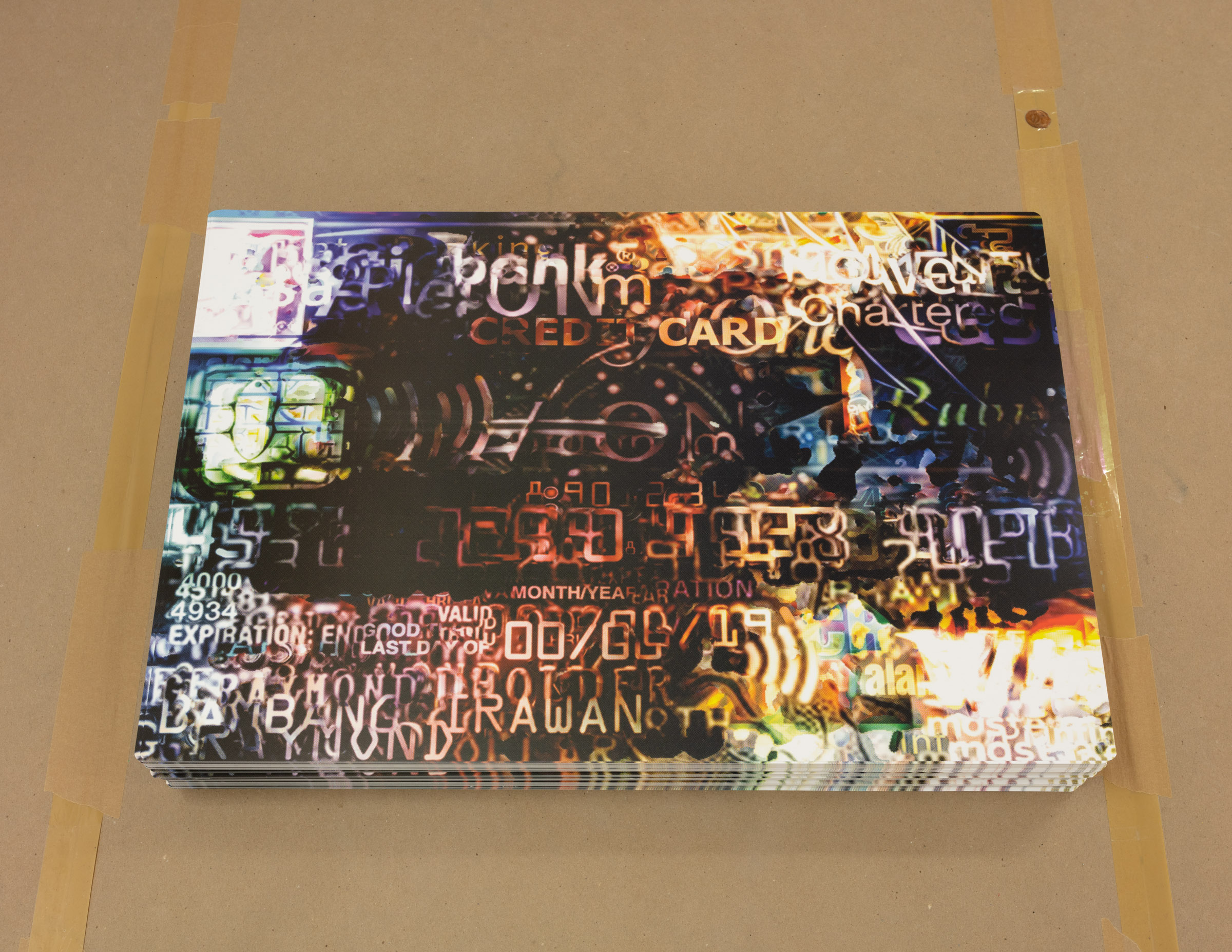A credit card represents many things; a human, a company, a system of fiat currency, capital, a site of neo-colonialism. Algorithms used internally at credit card companies to protect, secure and track data are so exact, they can predict a divorce with a 90% accuracy, two years in advance. The weight of a credit card is the approximate weight of plastic consumed into the human body on a weekly basis. The size of a credit card explores the disproportionate implications this small piece of plastic has on the human body and the systems of transaction, consumption, absorption and dissemination that circulate around it.