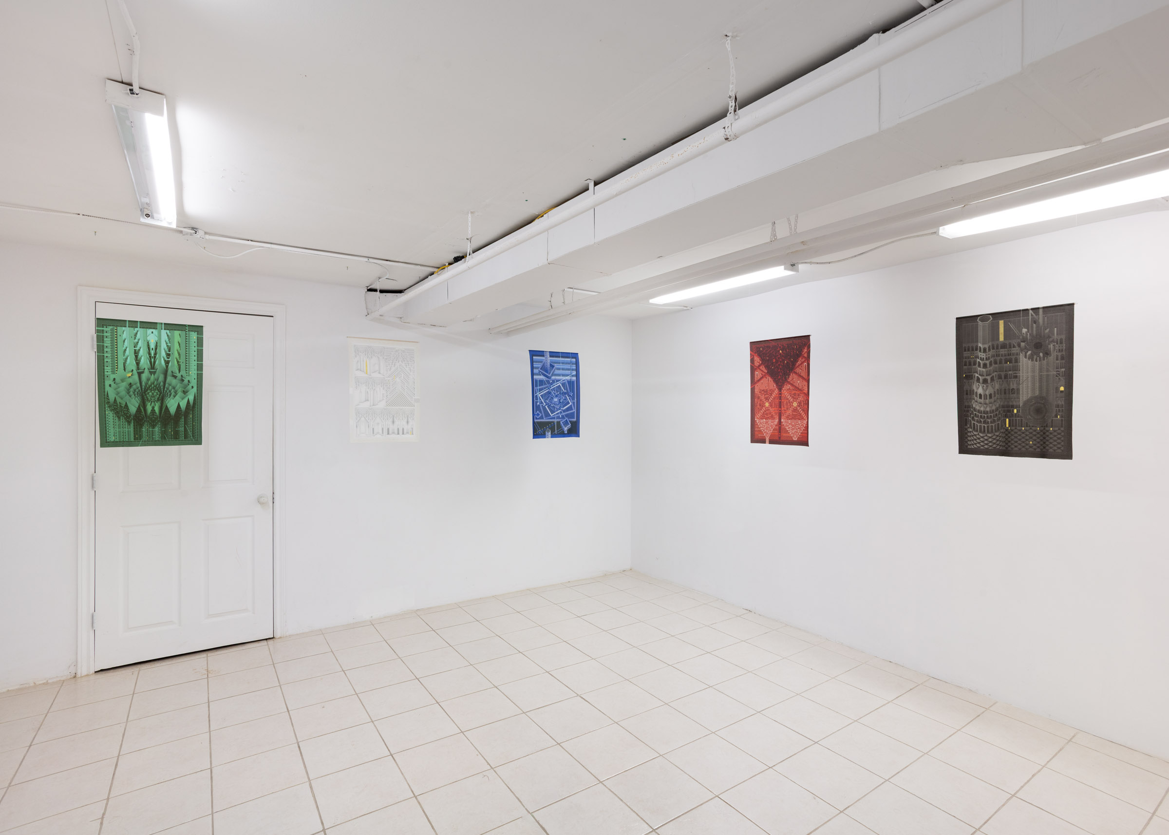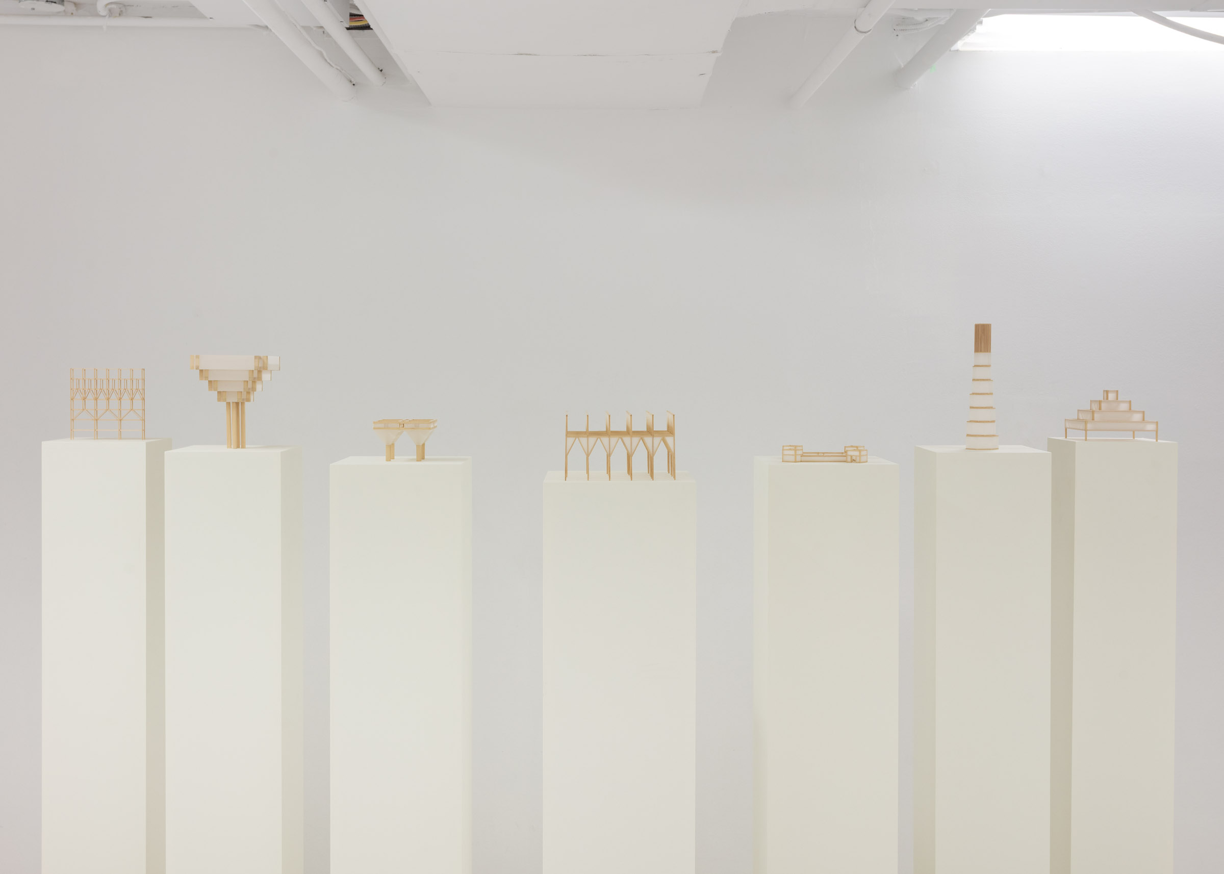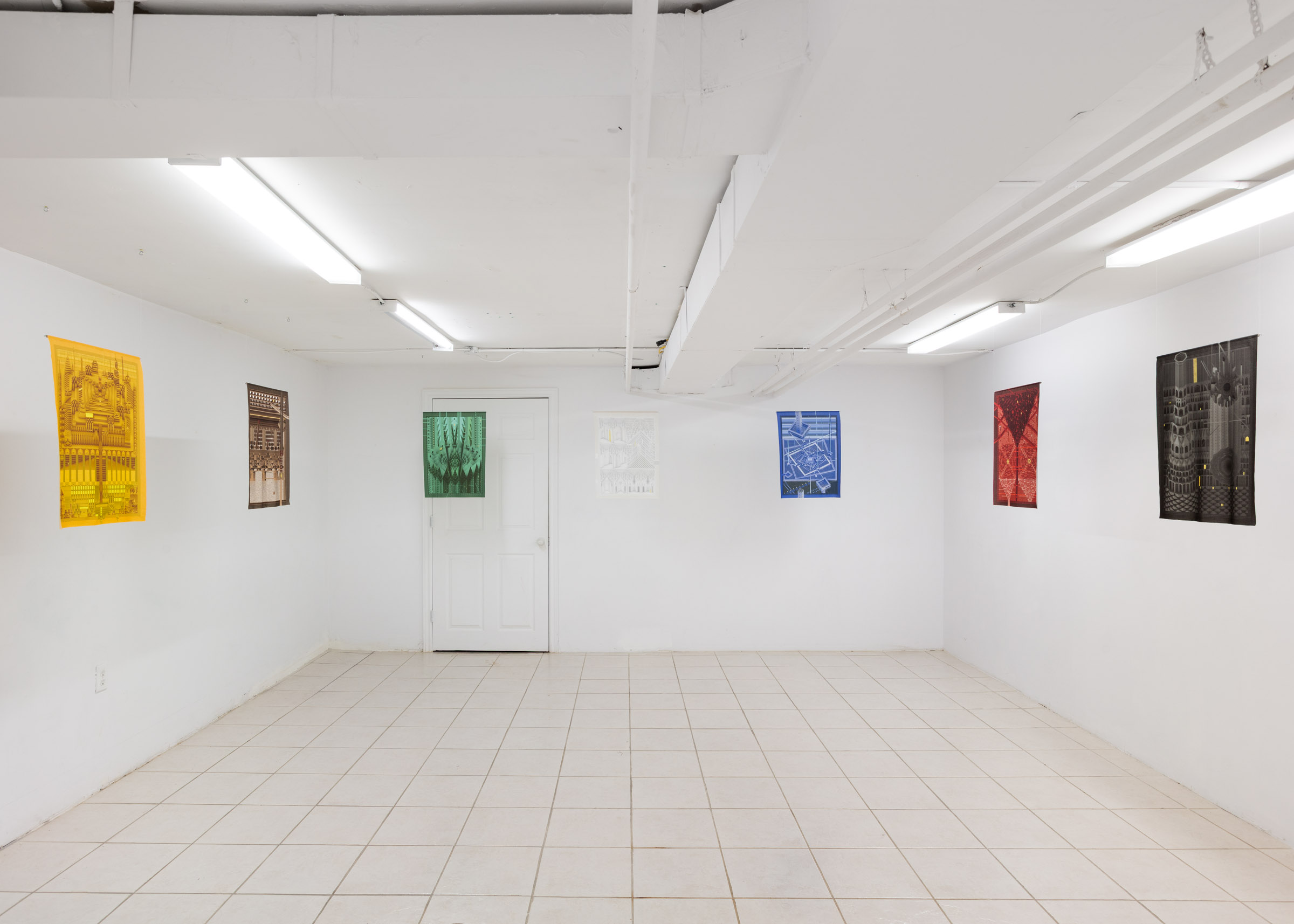Azar’s suits of sharp and tenuous sculptures barely touching down, answer to suspended prints of oblique imaginative geometries on fraying threads of sheer. Tracing Apparitions speaks languages of elemental architecture, distilled from anti-perspectival conventions of representation. The series reverberates with inherited architectural forms, carried across historical time and traversing the virtual and material (translation literally derived from latio, meaning carry, and trans meaning across).