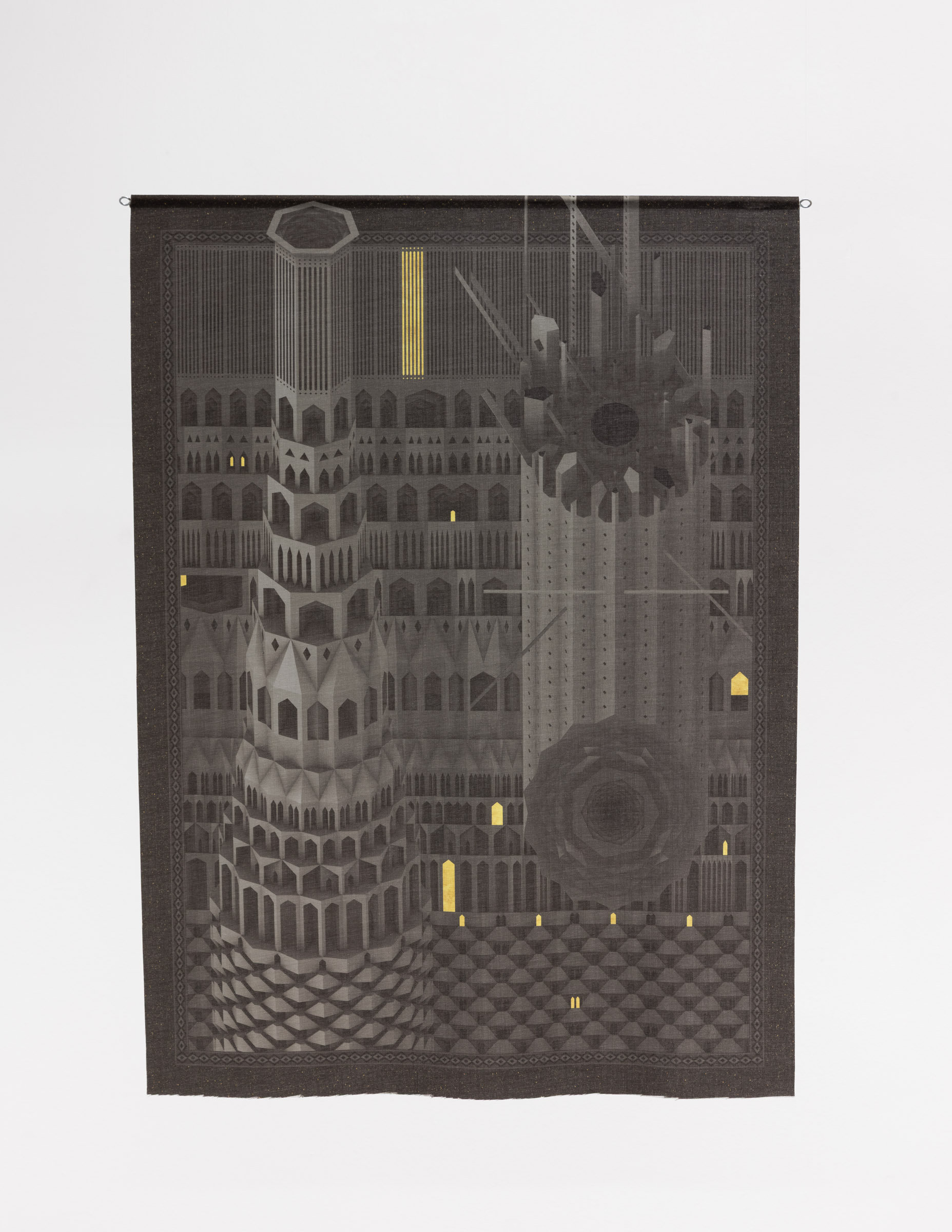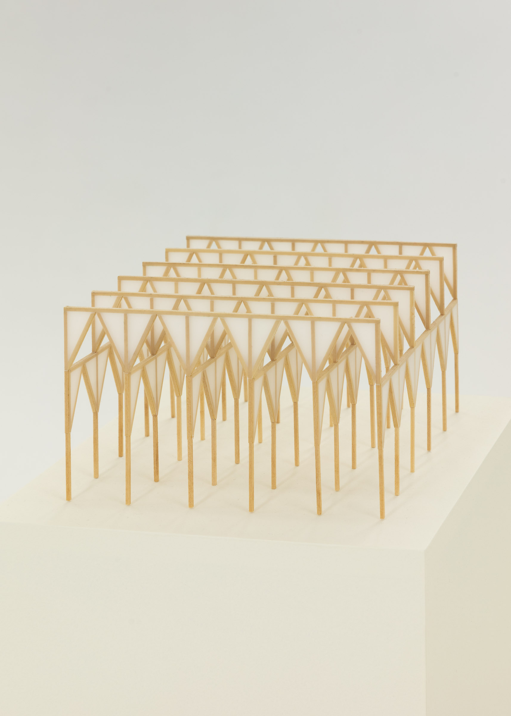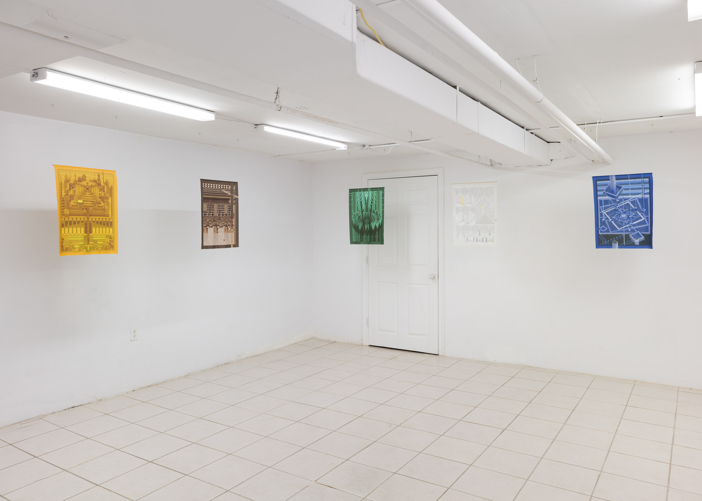Azar’s suits of sharp and tenuous sculptures barely touching down, answer to suspended prints of oblique imaginative geometries on fraying threads of sheer. Tracing Apparitions speaks languages of elemental architecture, distilled from anti-perspectival conventions of representation. The series reverberates with inherited architectural forms, carried across historical time and traversing the virtual and material (translation literally derived from latio, meaning carry, and trans meaning across).