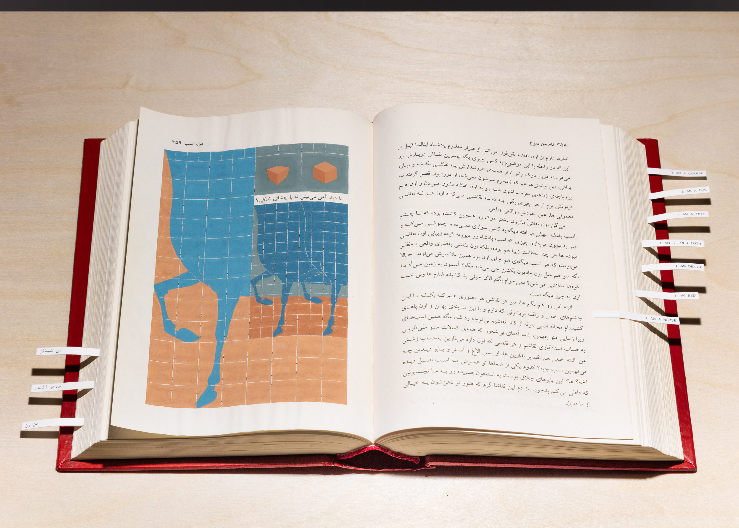 A copy of a Farsi translation of Benim Adım Kırmızı, Orhan Pamuk’s My Name Is Red, is altered by Azar’s interventions. Resting on negative grids, rows of painted equidistant squares transform text to image. The novel, which explores Ottoman miniaturist workshops and discordant traditions of representation becomes scaffolding for extensions of the story, speaking for and to its polyphonic narrative. Azar reconfigures visual motifs and allows text to peer out, interrupt, and speak occasionally—in affectionate, contemplative and questioning tones: