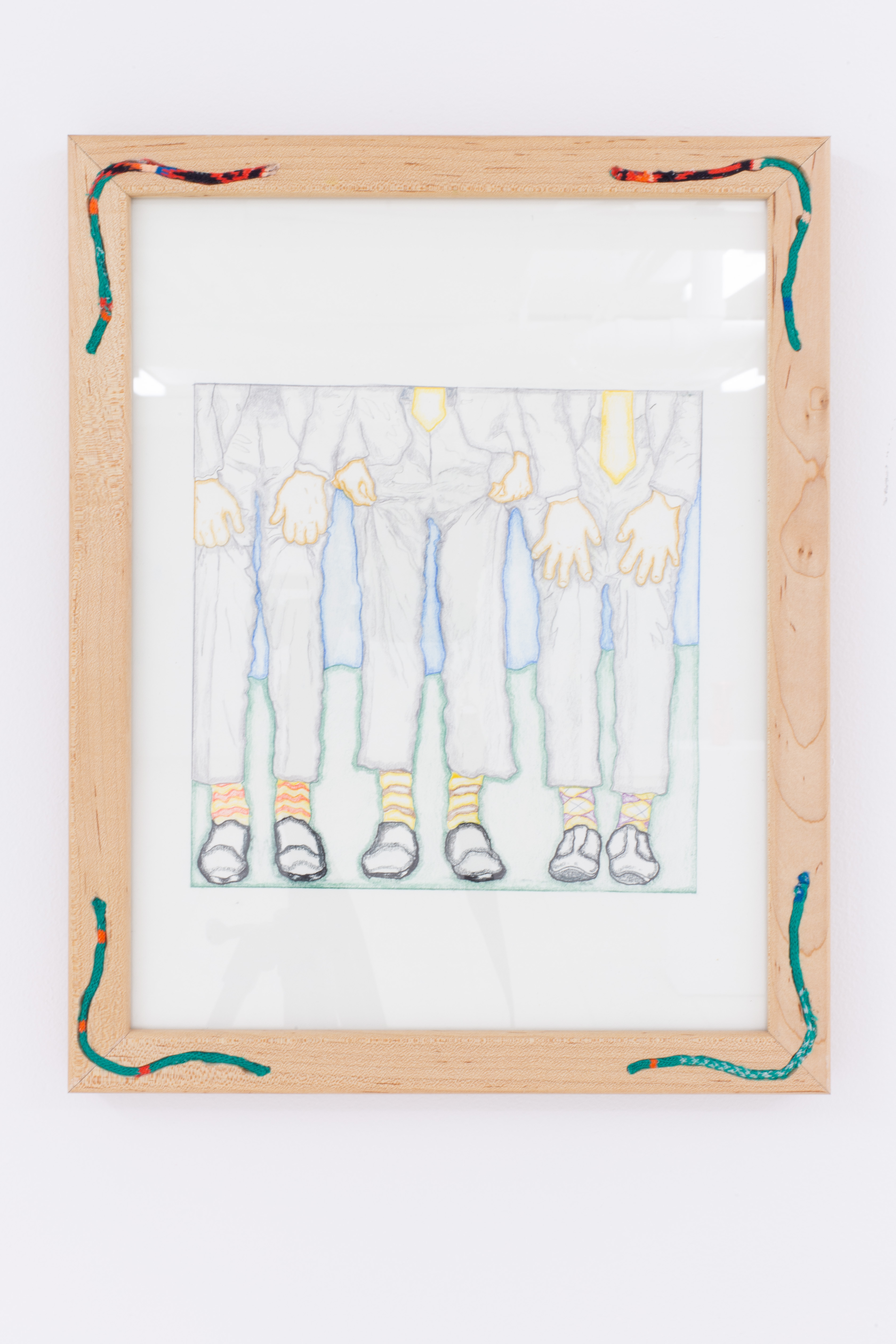 pencil crayon on paper, framed by the artist with sock fabric embedded in wood